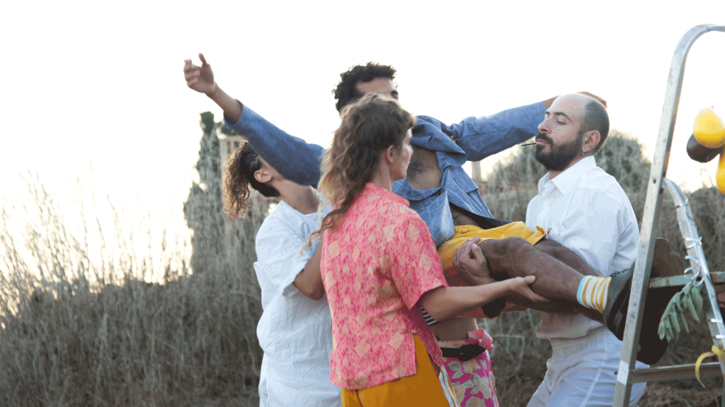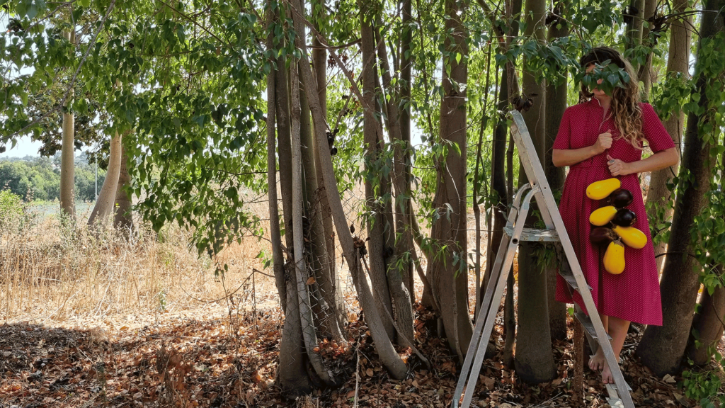 A performative act inspired by a song of Yasmeen Moalem. The song speaks of self redemption. I invite the performers and the crowd to redeem themselves and leap off the ladder – which symbolizes the past, and fall into our arms as an act of healing. There is a ladder on the land, it is decorated with silver strings and many eggplants. I give out lollipops to the performers and to the crowd; attached to the lollipop there is a small note with the words of the song. Each person at his/her own time is invited to climb on the ladder, read aloud the note and fall into the performer’s arms.